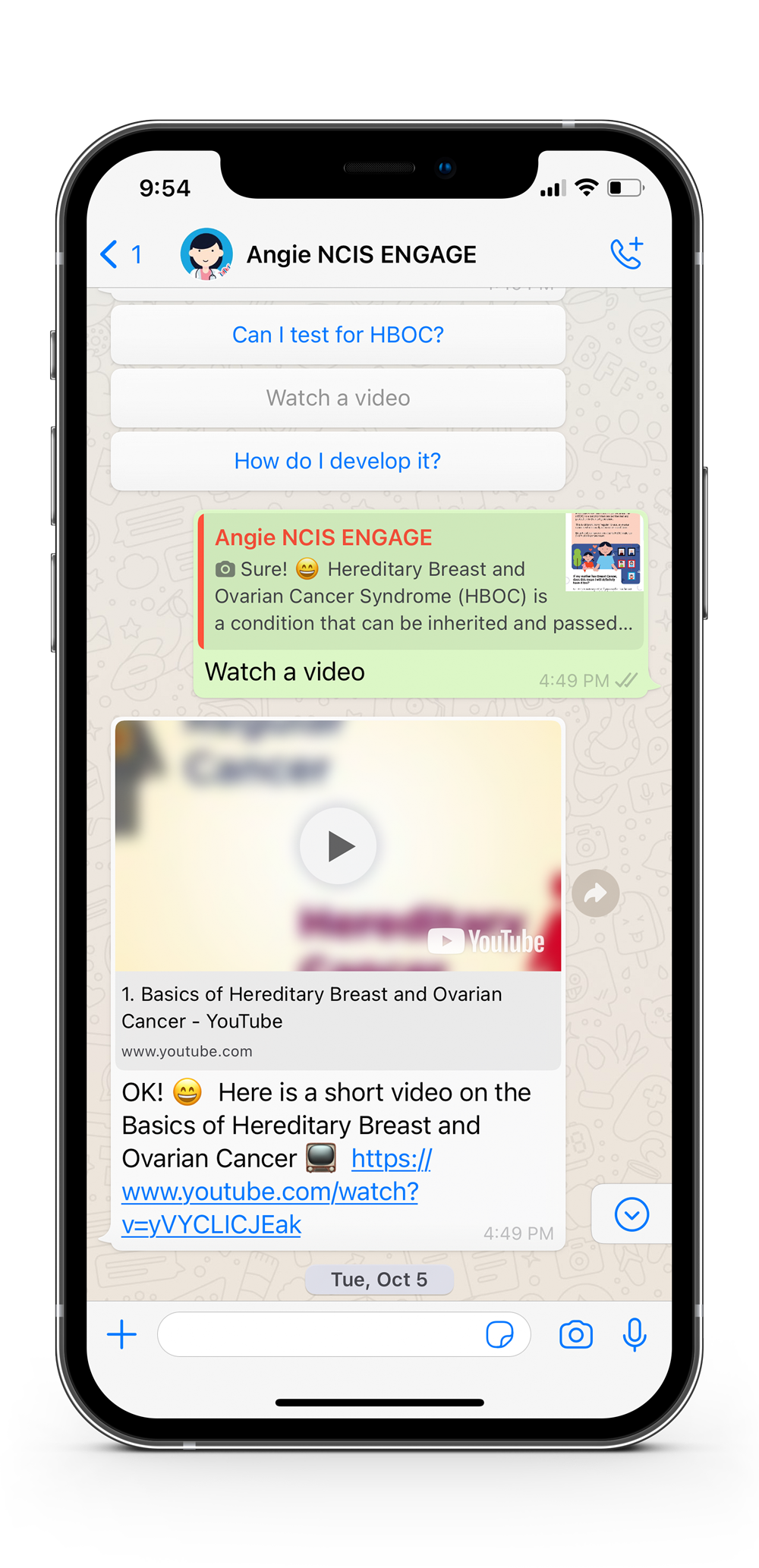 Angie helps to improve this patient experience by automating the collection of family medical history for risk assessment in the form of bite-sized modules delivered through WhatsApp. Patients can choose to complete their family medical history at their own convenience when they have the essential information on hand. Upon the completion of each module, the chatbot will send patients more information about HOBC, cancer genetic testing and the process of genetic counselling in the form of educational videos and infographics to help with the explanation.